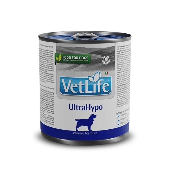 - Farmina Vet Life UltraHypo to pełnoporcjowa mokra karma dietetyczna dla psów, opracowana w celu obniżenia nietolerancji składników odżywczych. Karma ta może być stosowana jako dieta eliminacyjna oraz wspomaga funkcje skóry.