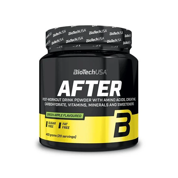 - BioTech USA After 420 g green apple to suplement diety w formie proszku przeznaczony do stosowania po treningu, charakteryzujący się orzeźwiającym smakiem zielonego jabłka o lekko kwaśnej nucie.