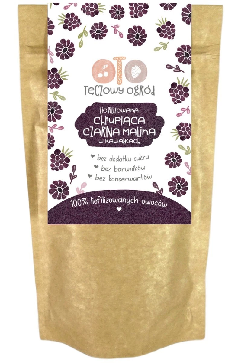 OTO Malina Czarna liofilizowana w kawałkach 20 g to starannie przygotowany produkt składający się wyłącznie z owoców poddanych procesowi liofilizacji. Dzięki tej metodzie maliny zachowują intensywny kolor, naturalny aromat i charakterystyczny smak. Produkt wyróżnia się prostym składem – zawiera on 100% owoców, bez dodatku cukru i sztucznych barwników, co czyni go przejrzystym i naturalnym wyborem.