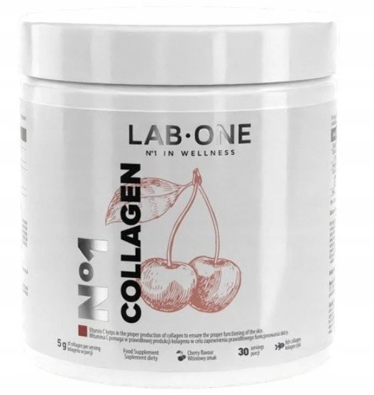 - LAB ONE N°1 Collagen Wiśnia 198 g to suplement diety w formie proszku zawierający kolagen o intensywnym smaku wiśni, charakteryzujący się przyjemnym, owocowym aromatem i starannie opracowaną formułą.