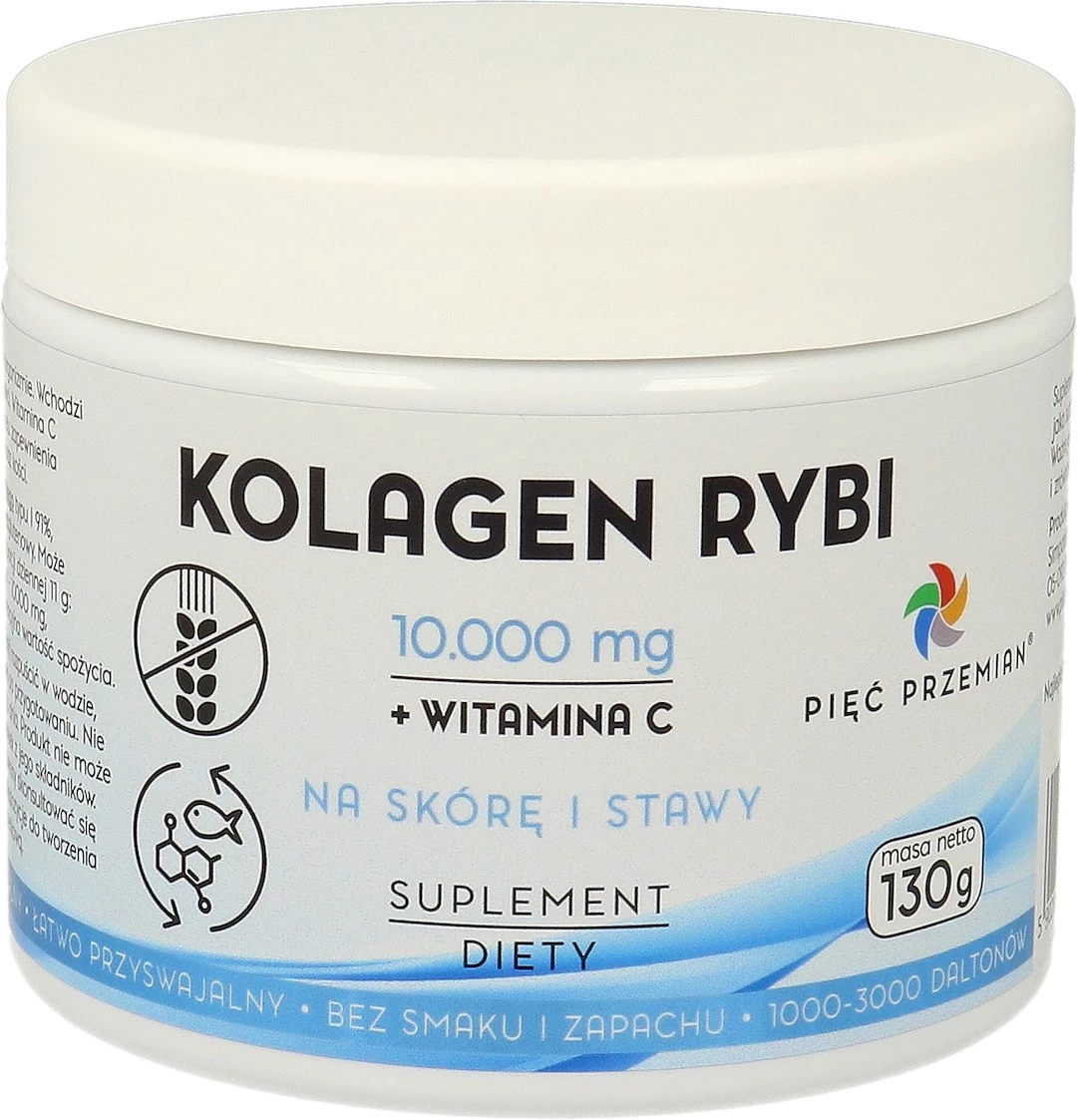 - Kolagen Rybi Pięć Przemian to suplement diety wspierający zdrowie skóry, stawów, kości, włosów i paznokci. Zawiera hydrolizowane tripeptydy kolagenu rybiego typu I o wysokiej biodostępności oraz witaminę C