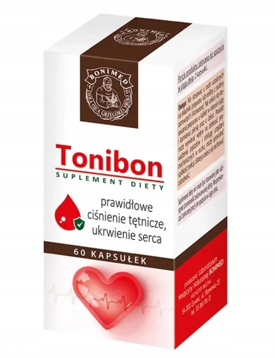 - Bonimed Tonibon 60 kapsułek Składniki zawarte w porcji dziennej (2 kapsułki):ekstrakt z owoców aronii 300 mgEkstrakt z kwiatostanu głogu 200 mgEkstrakt z ziela nawłoci 200 mgEkstrakt z korzenia kozłka 100 mgSzyszki chmielu 80 mg