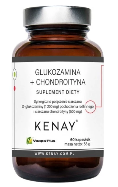 - Kenay Glukozamina + Chondroityna 60 K Suplement diety zawierający naturalne składniki chrząstki stawowej – siarczan D-glukozaminy oraz siarczan chondroityny – pozyskiwane z fermentacji roślinnej.