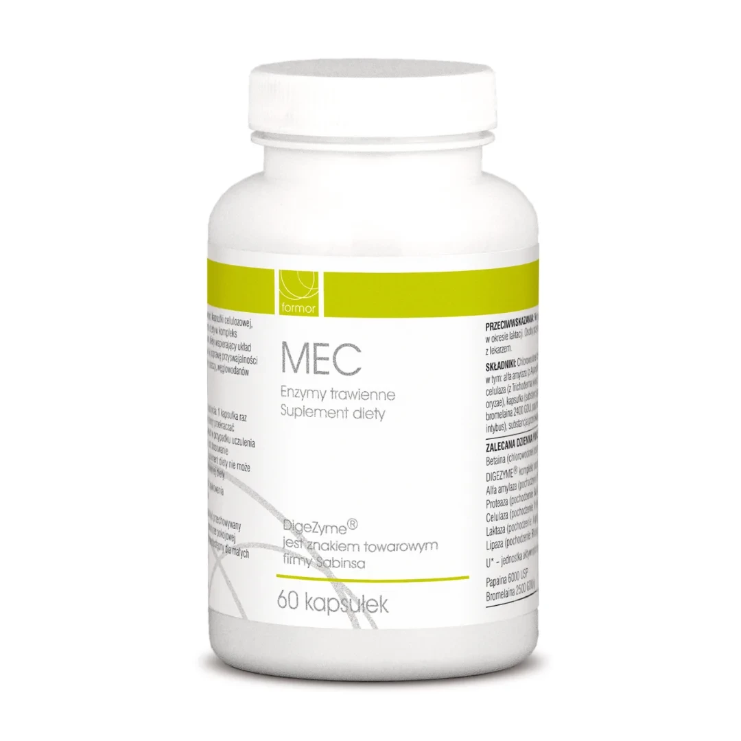 - MEC Enzymy trawienne to produkt, który zawiera kompleks enzymów wspierających procesy rozkładu różnych składników pokarmowych. Enzymy takie jak amylaza, proteaza i lipaza odgrywają kluczową rolę w rozkładzie węglowodanów, białek i tłuszczów