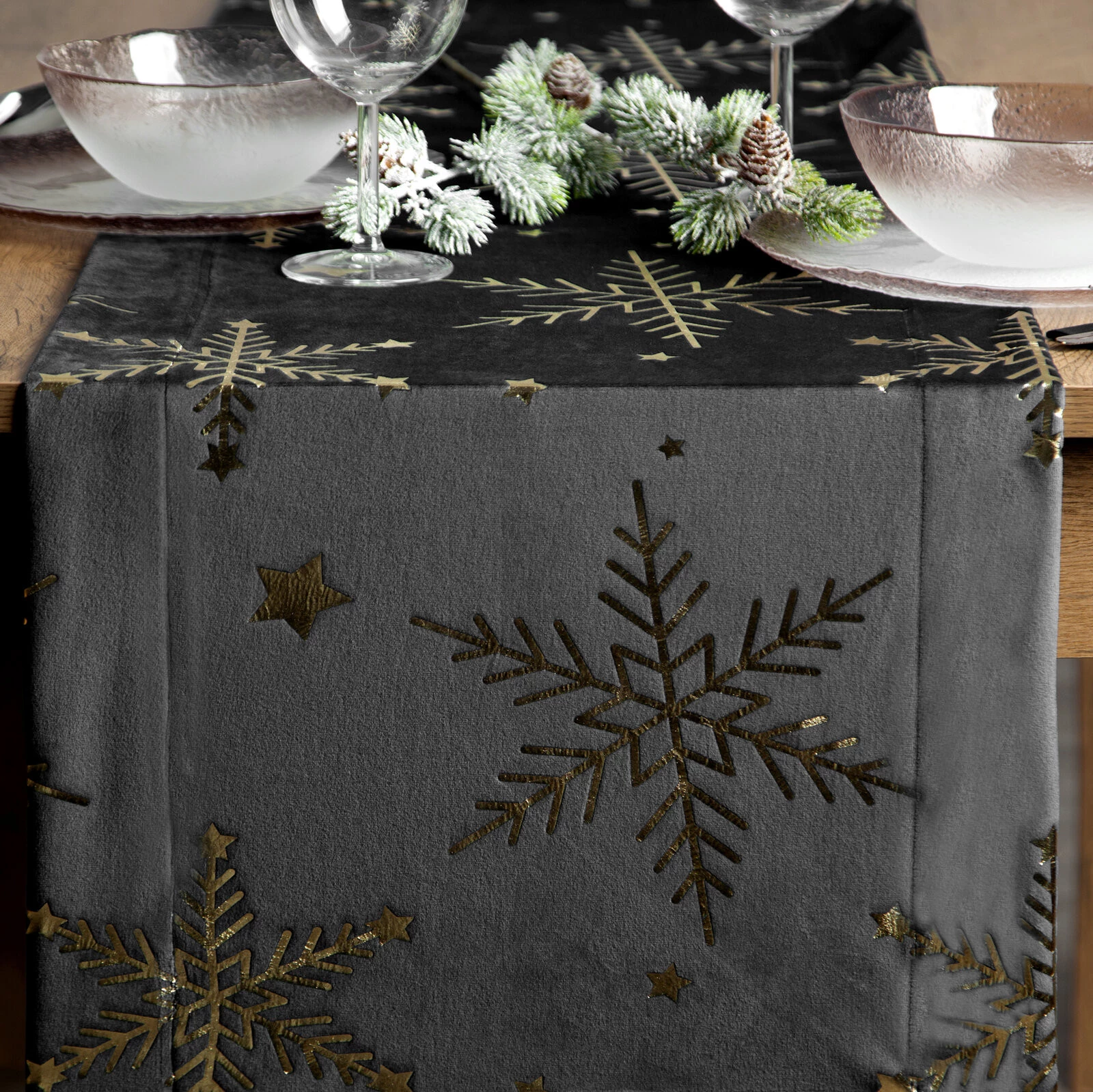 - Wprowadź nutę elegancji i świątecznego blasku do swojego wnętrza dzięki wyjątkowemu bieżnikowi wykonanym z miękkiej, welwetowej tkaniny. Subtelny połysk materiału w połączeniu z błyszczącym, szampańskim nadrukiem śnieżynek