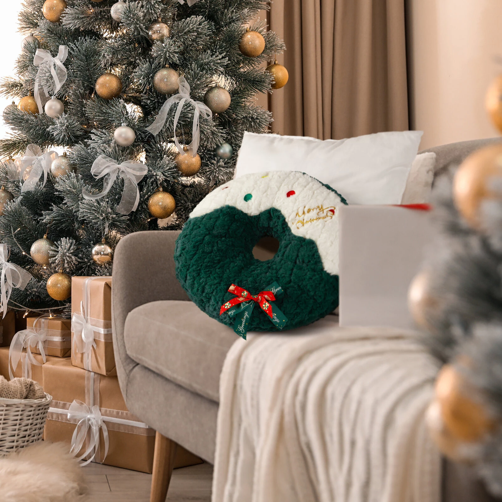 - Wprowadź do swojego wnętrza radosny, świąteczny nastrój z uroczą poduszką dekoracyjną w kształcie pączka. Poduszka świąteczna Donut to połączenie stylu, humoru i komfortu – doskonale sprawdzi się jako świąteczna ozdoba