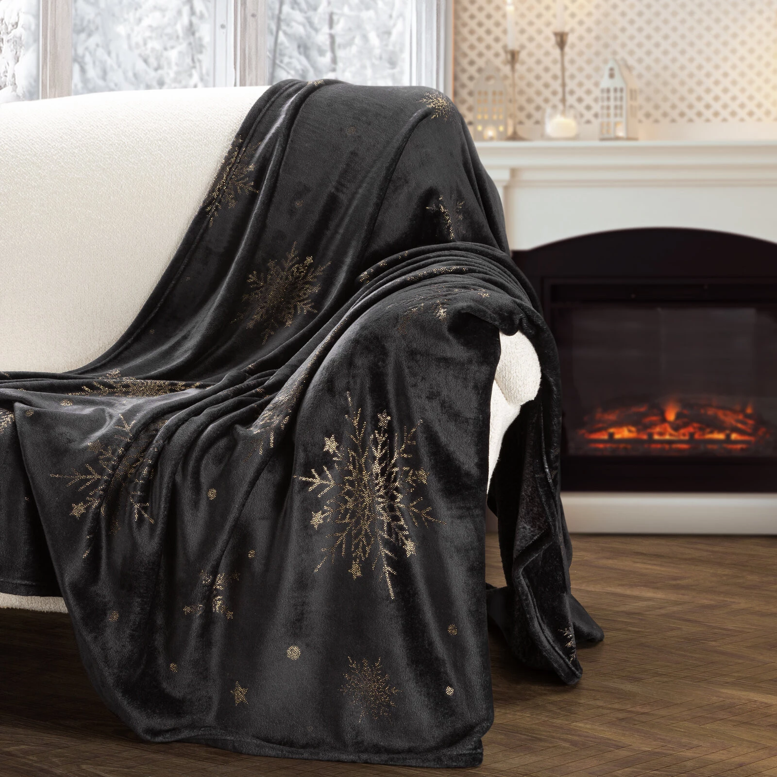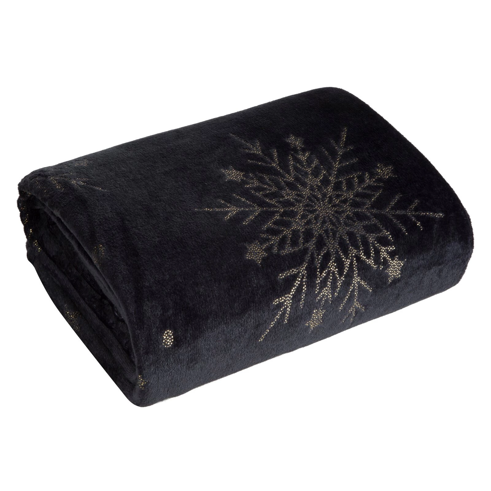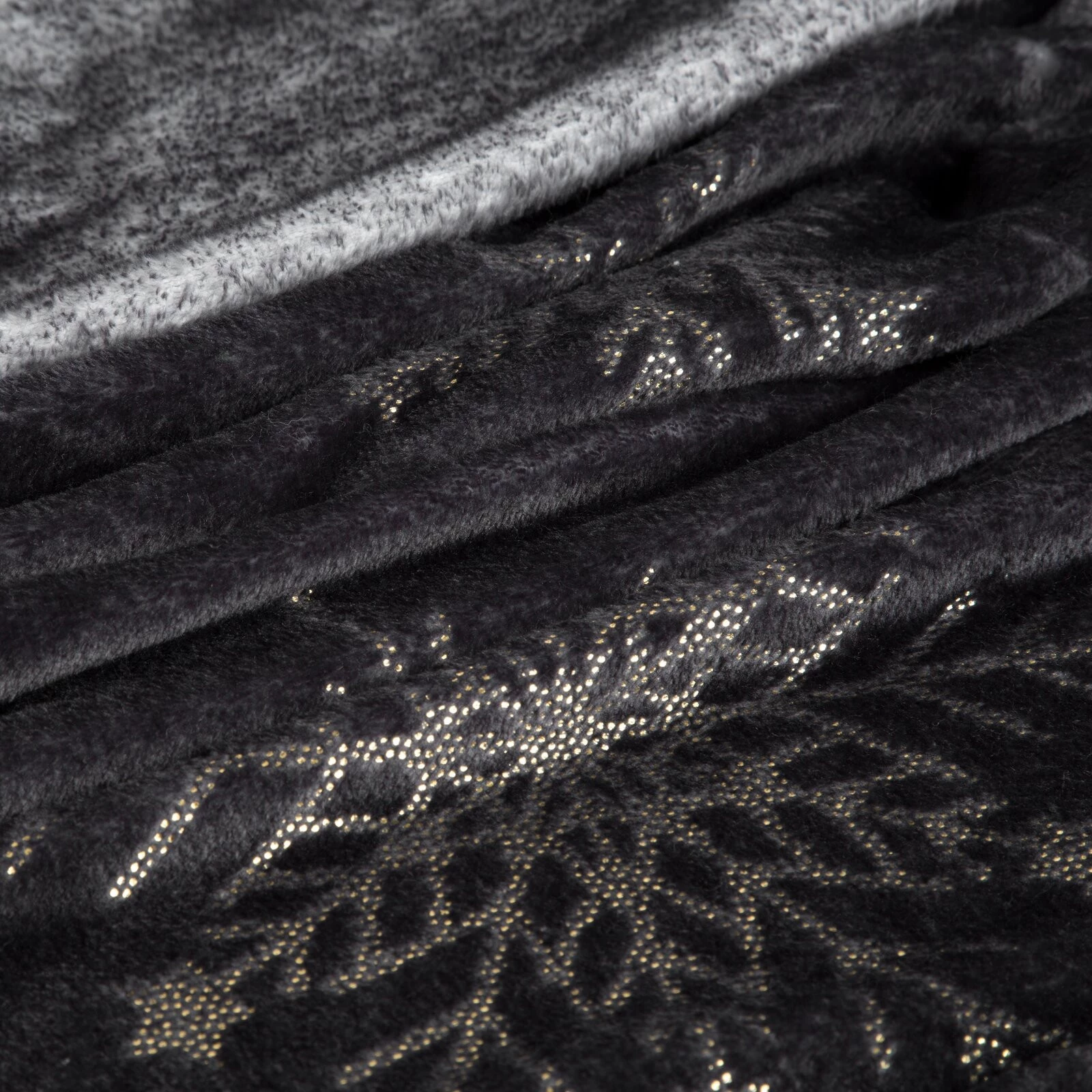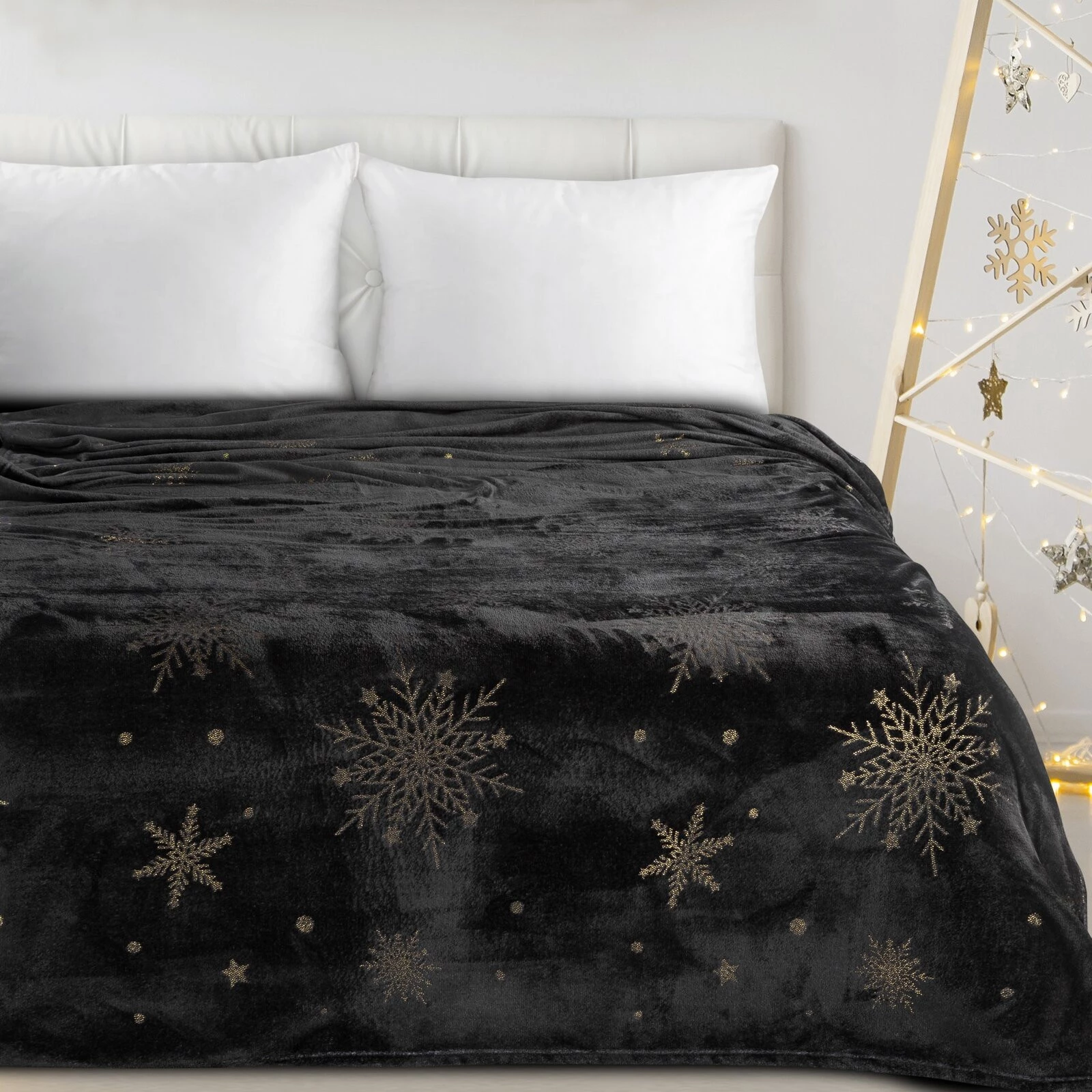Miękki koc z flano o gramaturze 240 g/m² zapewni ciepło i komfort w zimowe wieczory. Ozdobiony złotymi śnieżynkami na czarnym tle, doda wnętrzu eleganckiego, świątecznego charakteru. Idealny jako narzuta lub koc do okrycia.