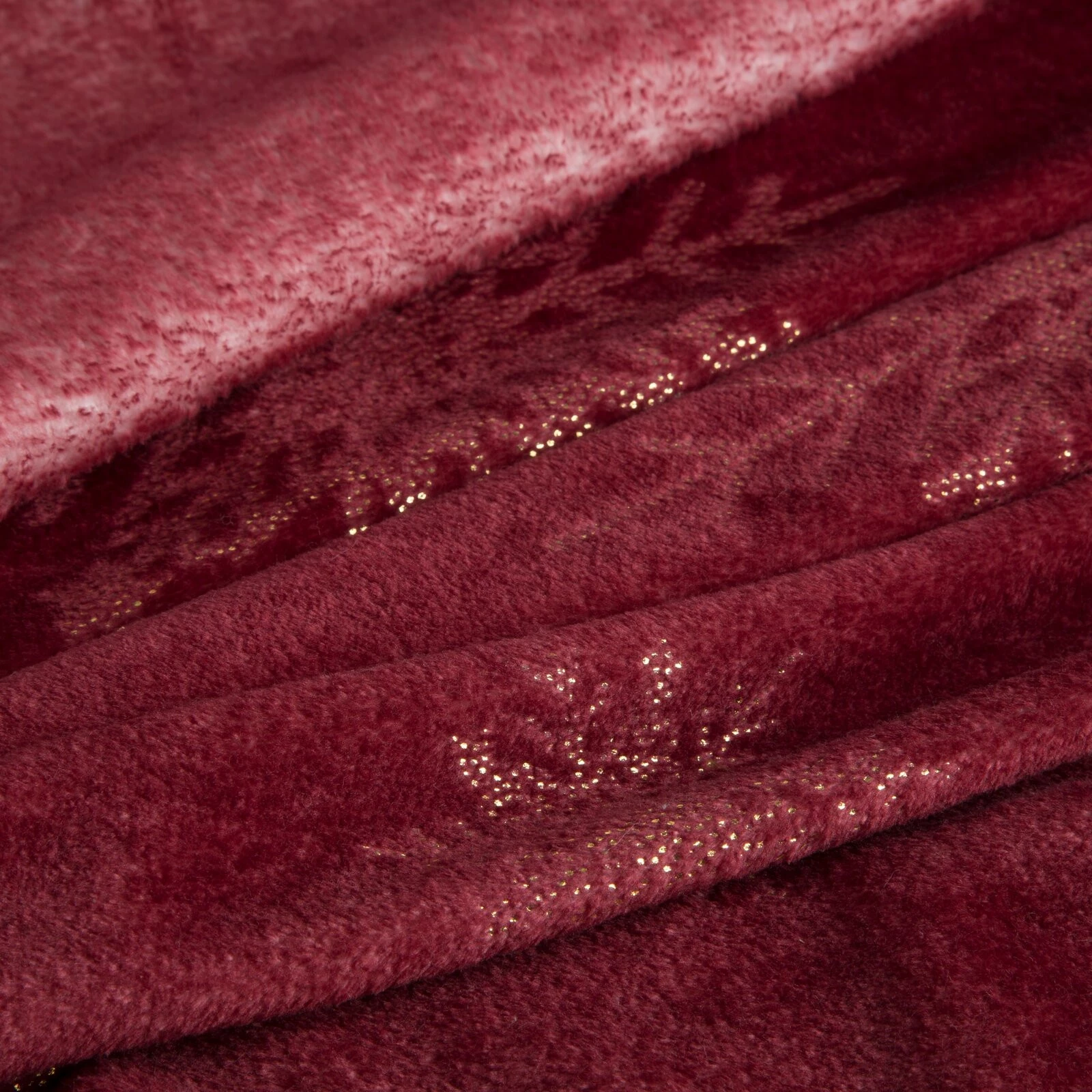 Miękki koc z flano o gramaturze 240 g/m² zapewni ciepło i komfort w zimowe wieczory. Ozdobiony złotymi śnieżynkami na bordowym tle, doda wnętrzu eleganckiego, świątecznego charakteru. Idealny jako narzuta lub koc do okrycia.
