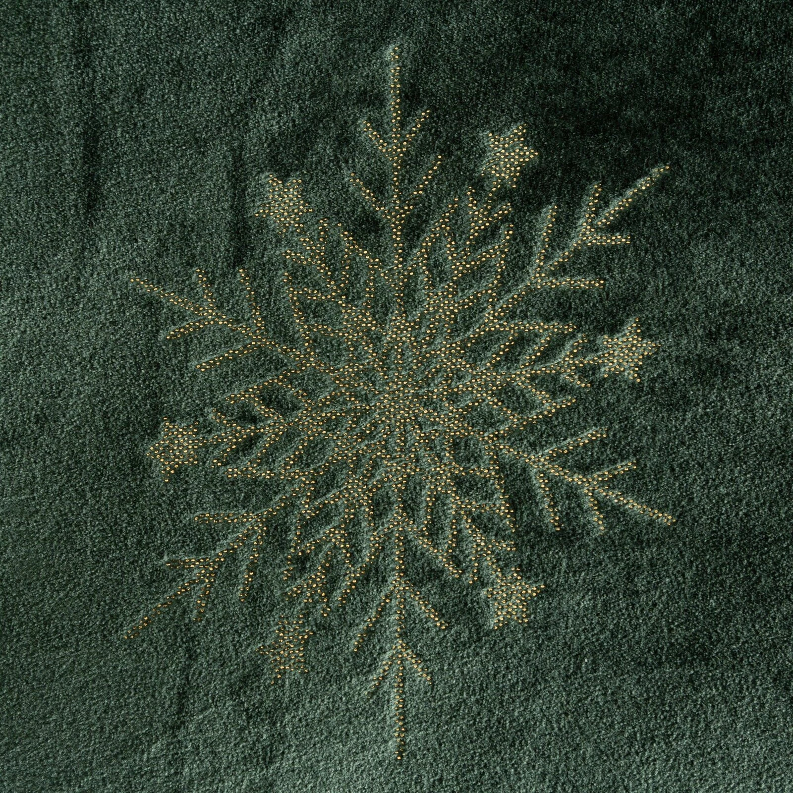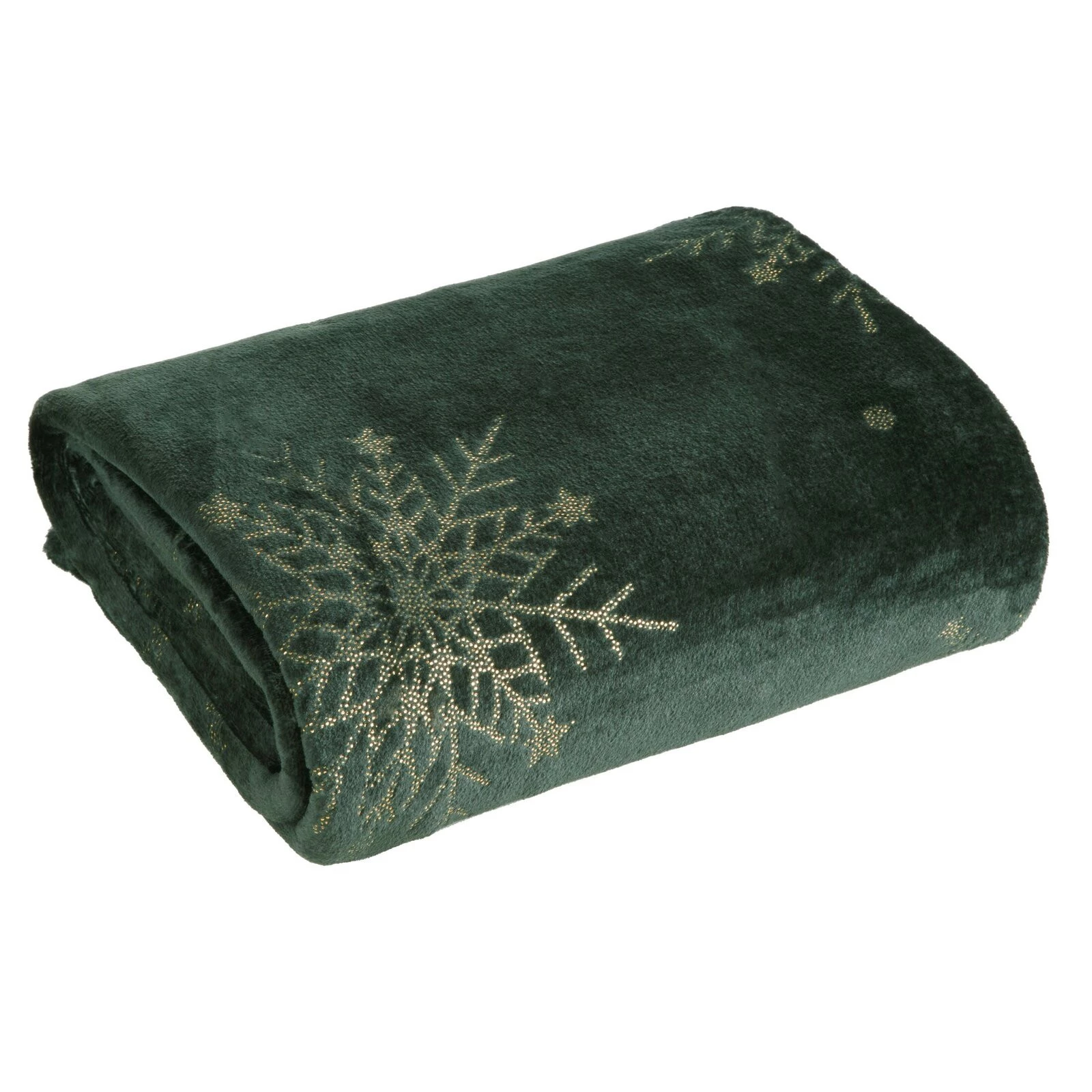 Miękki koc z flano o gramaturze 240 g/m² zapewni ciepło i komfort w zimowe wieczory. Ozdobiony złotymi śnieżynkami na ciemnozielonym tle, doda wnętrzu eleganckiego, świątecznego charakteru. Idealny jako narzuta lub koc do okrycia.