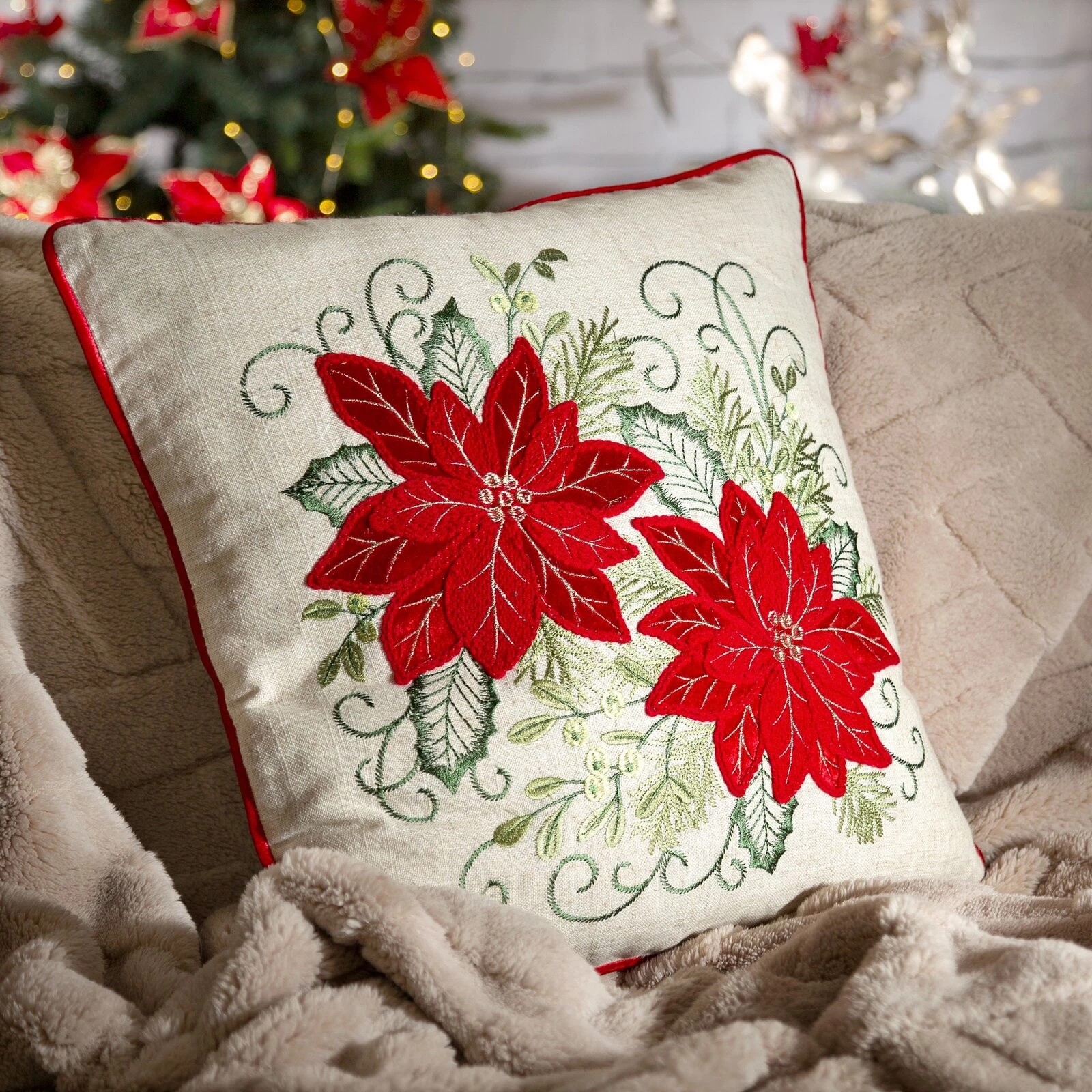 - Elegancka świąteczna poszewka z haftowanym motywem i ozdobną wypustką. Stylowy dodatek, który doda wnętrzu ciepła i świątecznego uroku – idealna na kanapę, fotel lub łóżko.