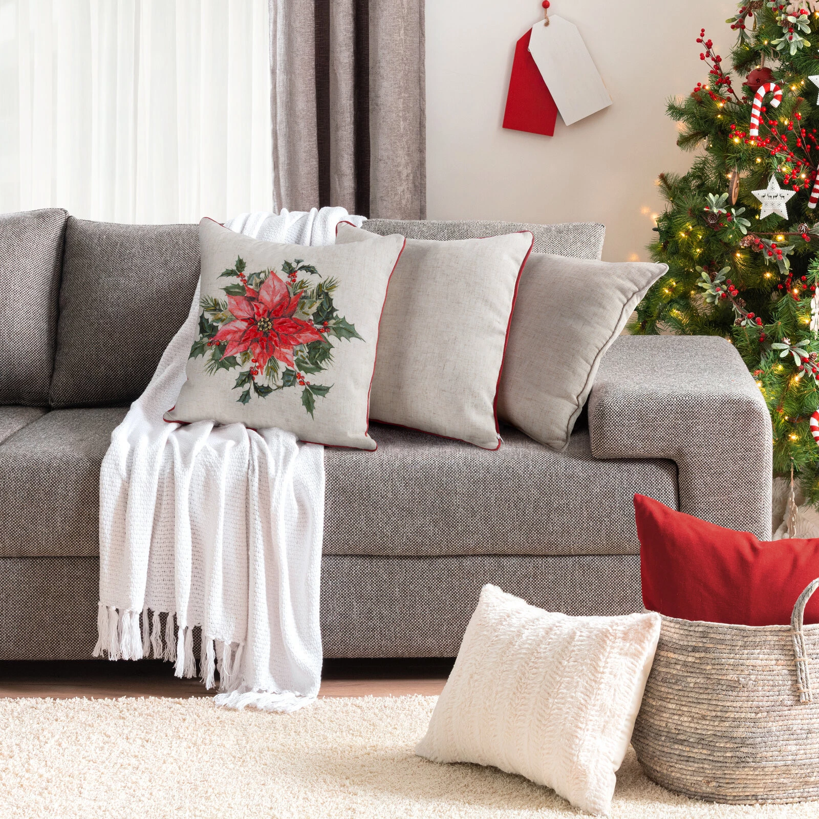 Wprowadź do swojego wnętrza elegancję i świąteczny nastrój dzięki dekoracyjnej poszewce wykonanej z tkaniny imitującej len. Naturalna faktura i subtelna haftowana aplikacja nadają jej przytulny, stylowy charakter, a ozdobna wypustka na brzegach podkreśla dbałość o detale. Idealna jako dekoracja kanapy, fotela lub łóżka w okresie Bożego Narodzenia.