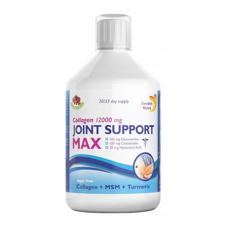 - Swedish Joint Support MAX to kompleksowy suplement diety w płynie, który wspiera zdrowie stawów, kości, chrząstki i skóry. Zawiera aż 12000 mg kolagenu wołowego typu I, II i III, a także glukozaminę, chondroitynę, MSM, kwas hialuronowy i kurkumę.