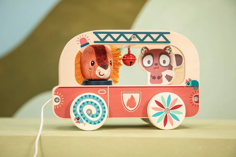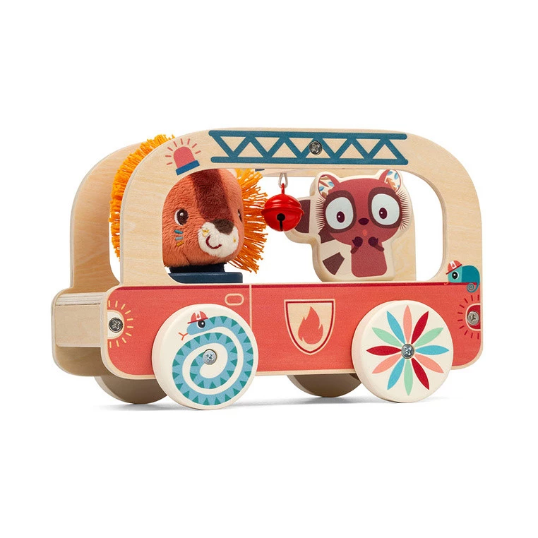 Drewniany pojazd do ciągnięcia z kolekcji Lew Jack belgijskiej marki Lilliputiens to niebanalna zabawka, która wspiera dziecko w rozwoju ruchowym i pobudza wyobraźnię. Kolorowy wóz strażacki ma obłe kształty, jest otwarty i przewozi dwóch wyjątkowych pasażerów: drewnianego Lemura Elvisa, który obraca się podczas jazdy i uderza w dzwoneczek, oraz pluszowego Lwa Jacka, którego można wyciągać i wkładać na miejsce kierowcy. Pojazd jest łatwy do prowadzenia – można go ciągnąć na sznureczku (z możliwością odczepienia) lub pchać. Dodatkowo kółka wozu tworzą ciekawe efekty wizualne w ruchu.