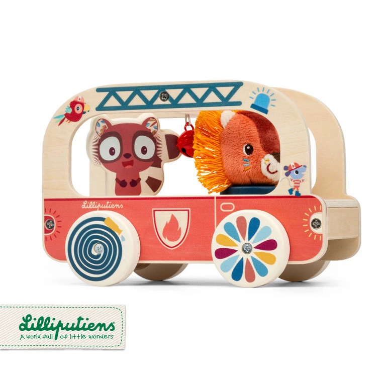 Lilliputiens Drewniany wózek do ciągnięcia Wóz strażacki Lew Jack 12 m+