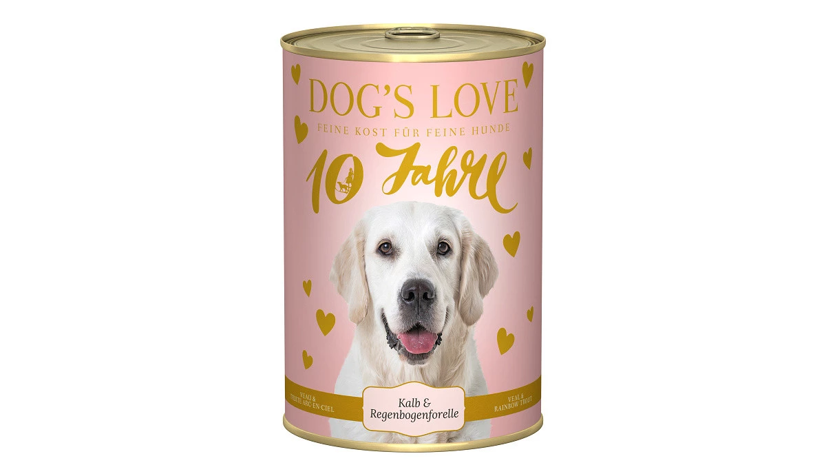- Jubileuszowa, limitowana edycja karmy z okazji 10-lecia marki DOG'S LOVE. Połączenie cielęciny i pstrąga tęczowego zapewnia psom wyjątkowe doznania smakowe