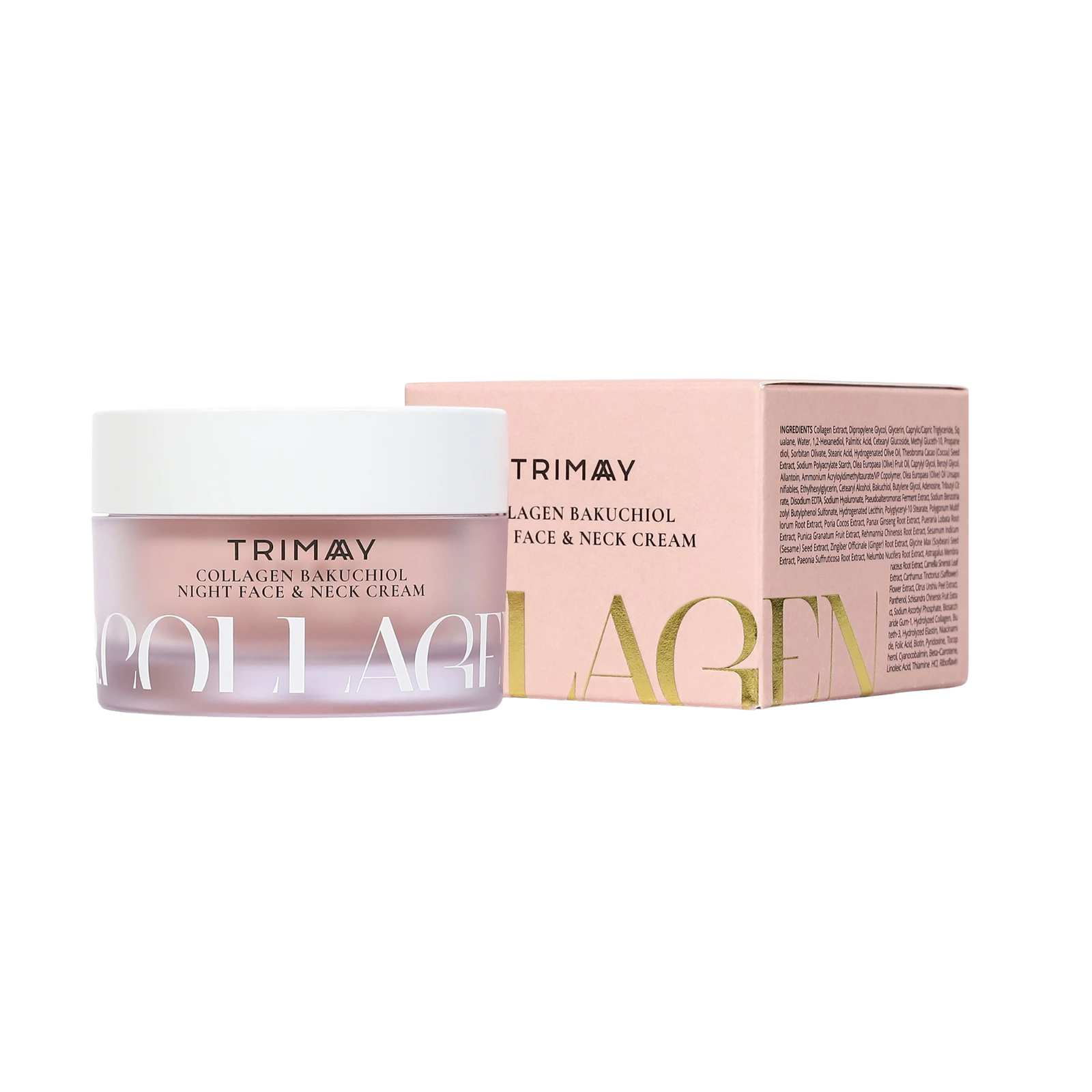 Krem na noc do twarzy i szyi Trimay Collagen Bakuchiol Night Cream zawiera kolagen, bakuchiol oraz kompleks składników odżywczych i roślinnych, które wspierają nawilżenie i elastyczność skóry podczas snu.