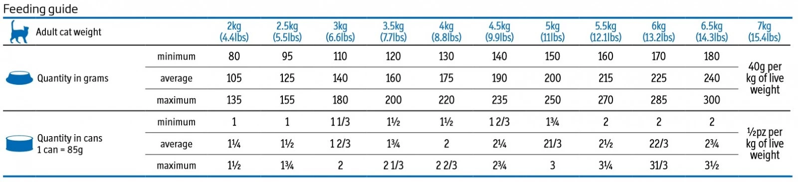 Karmę podawać zgodnie z zaleceniami lekarza weterynarii, w temperaturze pokojowej. Kot powinien mieć stały dostęp do świeżej wody.
