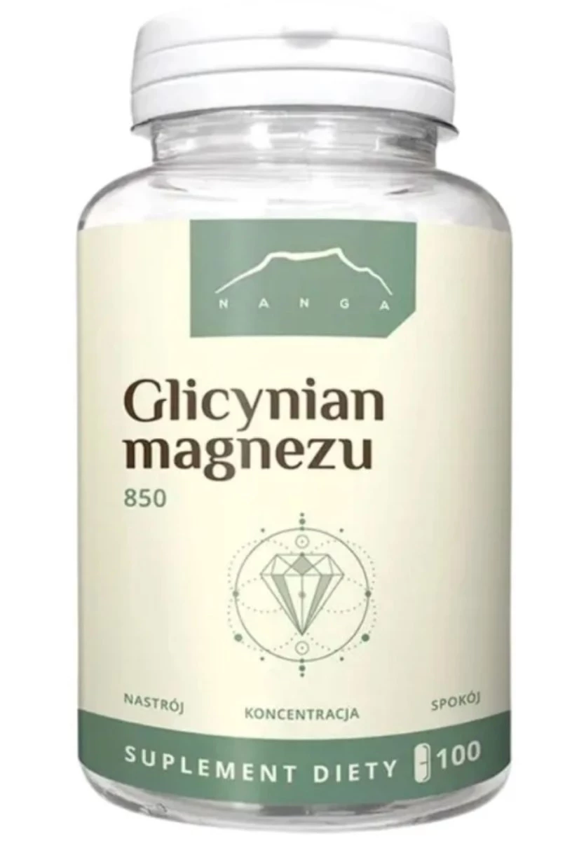 - Nanga Glicynian magnezu chelat 850 mg 100 kapsułek wyróżnia się chelatowaną formą magnezu o wysokiej biodostępności i wygodną formą kapsułek.