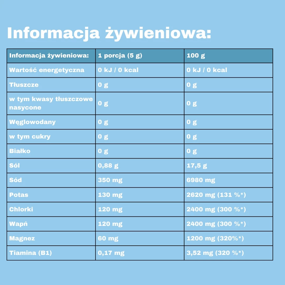 - ✅ Uzupełnia elektrolity: sód, potas, magnez, wapń i chlorek