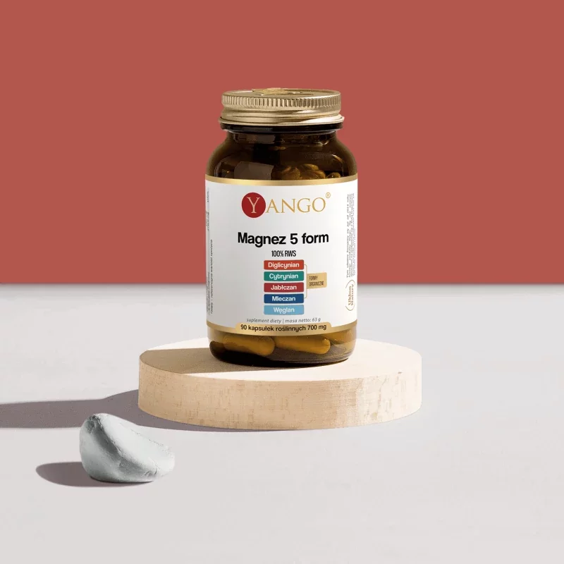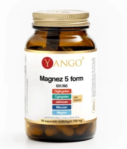 - YANGO® Magnez 5 form to kompleksowy suplement diety łączący aż pięć źródeł magnezu – diglicynian, cytrynian, węglan, jabłczan i mleczan.