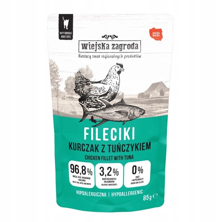 - Naturalna mokra karma Wiejska Zagroda Fileciki Kurczak z tuńczykiem to delikatne, soczyste kawałeczki mięsa zanurzone w aromatycznym sosie, stworzone dla kotów ceniących smak i wysoką jakość posiłku.