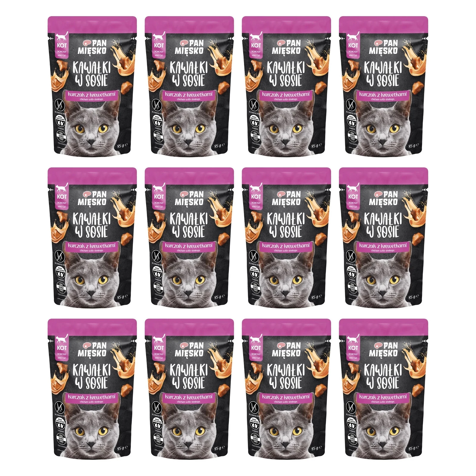 Zestaw 12x Pan Mięsko Kawałki w sosie Kurczak z krewetkami - mokra karma dla kota 85g