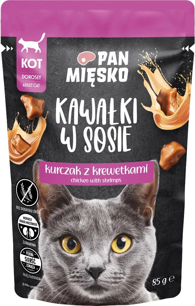 - Zadbaj o wyjątkowy posiłek swojego kota z karmą Pan Mięsko Kurczak z krewetkami. Delikatne kawałki mięsa kurczaka i krewetek, zanurzone w aromatycznym sosie, zaspokoją nawet najbardziej wymagające kocie podniebienia.