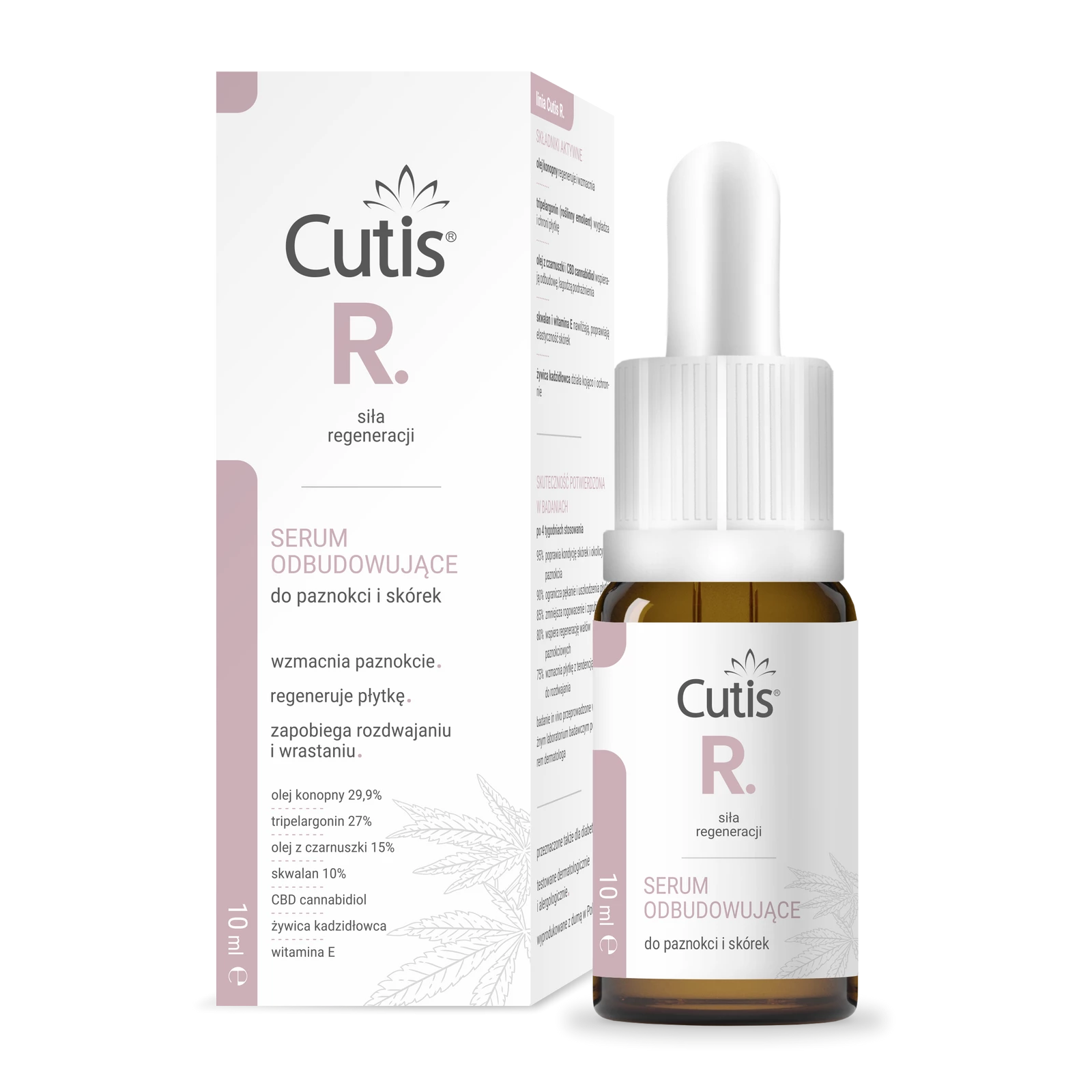 Cutis R-REGENERACJA serum odbudowujące do paznokci i skórek to preparat przeznaczony do paznokci osłabionych, łamliwych, rozdwajających się, skłonnych do pękania i rogowacenia, wymagających regeneracji – również po zabiegach stylizacji (hybryda, żel). Polecane do codziennej pielęgnacji skórek i okolic paznokci oraz jako wsparcie w profilaktyce wrastania.