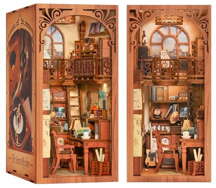 „Sekretny gabinet” to wyjątkowy Book Nook do samodzielnego montażu, który przeniesie Cię w świat tajemniczych ksiąg, starych globusów i magii wiedzy. Precyzyjnie laserowo wycinane elementy z nadrukiem UV, szczegółowe wykończenia i ciepłe oświetlenie LED tworzą niezwykły klimat. Model idealny dla miłośników książek, zagadek i kreatywnego DIY.