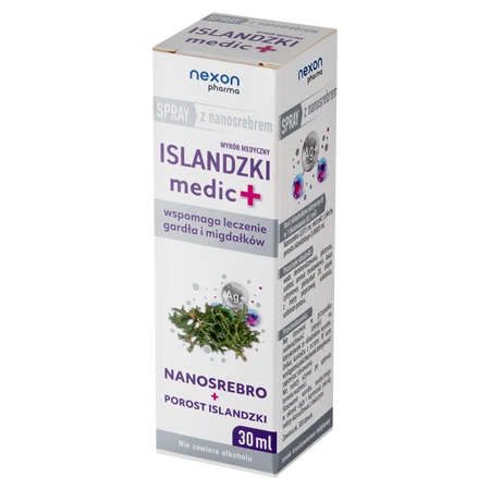 - ISLANDZKI Medic+ to wyrób medyczny w postaci sprayu z nanosrebrem i porostem islandzkim. Wspiera łagodzenie stanów zapalnych gardła, jamy ustnej oraz migdałków.