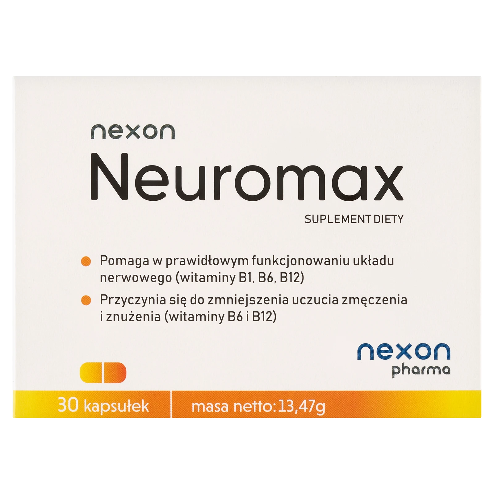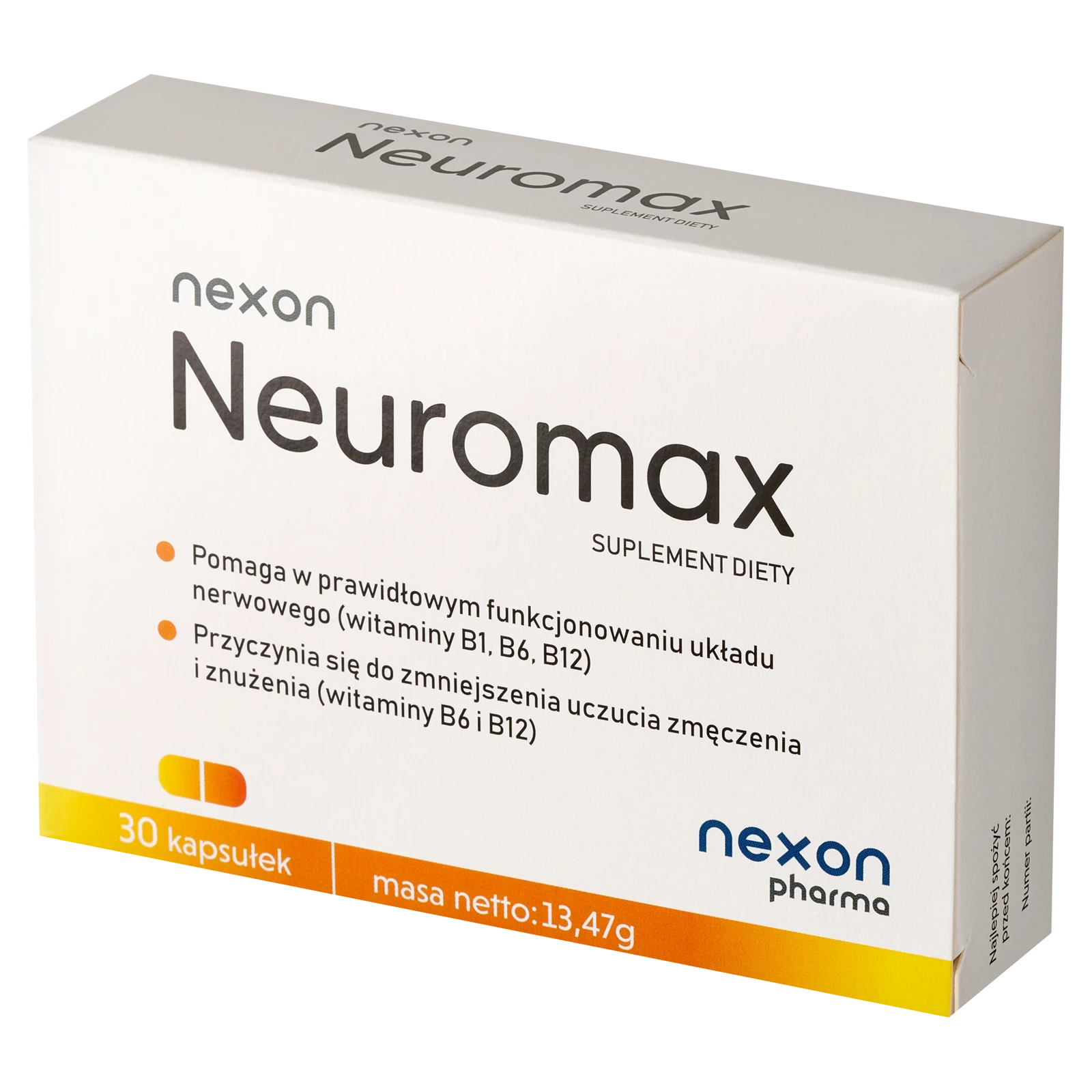 - NEXON Neuromax to suplement diety zawierający wysokie dawki witamin z grupy B: B1, B6 oraz B12.