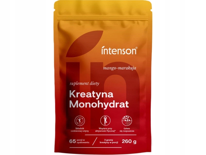 - Kreatyna INTENSON o smaku mango-marakuja to wysokiej jakości proszek zawierający monohydrat kreatyny – najlepiej przebadaną i najskuteczniejszą formę kreatyny.