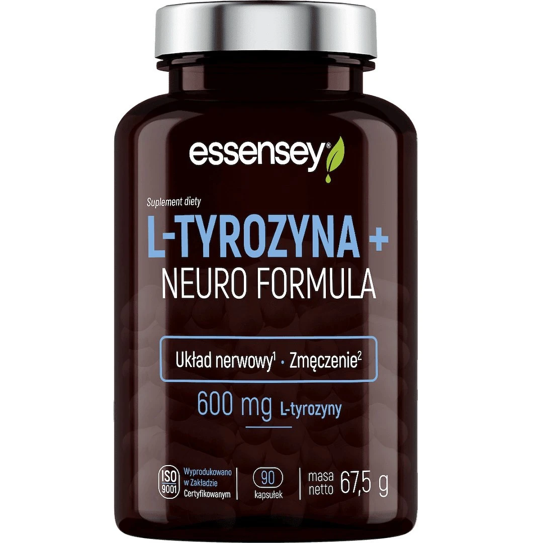 - ESSENSEY L-TYROZYNA+ NEURO FORMULA to suplement diety w postaci kapsułek zawierający L-tyrozynę oraz witaminy B6 i B12. Produkt wspiera prawidłową pracę układu nerwowego, zmniejsza uczucie zmęczenia oraz dostarcza 600 mg L-tyrozyny w jednej kapsułce.