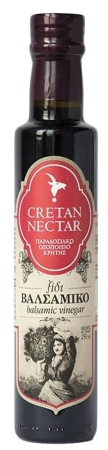 Grecki ocet balsamiczny marki Cretan Nectar uzyskiwany wyłącznie z winogron suszonych na słońcu. Oparty na tradycyjnej greckiej recepturze nie zawiera żadnych konserwantów ani barwników. Dojrzewa w dębowych beczkach, dzięki czemu uzyskuje wyjątkowy słodko-kwaśny smak, charakterystyczny dla octów balsamicznych z rejonu Morza Śródziemnego. Ciemne winogrona wykorzystane do jego wytworzenia pochodzą z odmiany korynckiej. Ocet balsamiczny polecany jest do sałat, dressingów, marynat oraz jako dodatek do świeżych lub gotowanych warzyw. Idealnie sprawdzi się do wieprzowiny, drobiu oraz warzyw. SKŁADNIKI: recki ocet balsamiczny marki Cretan Nectar uzyskiwany wyłącznie z winogron suszonych na słońcu. Oparty na tradycyjnej greckiej recepturze nie zawiera żadnych konserwantów ani barwników. Dojrzewa w dębowych beczkach, dzięki czemu uzyskuje wyjątkowy słodko-kwaśny smak, charakterystyczny dla octów balsamicznych z rejonu Morza Śródziemnego. Ciemne winogrona wykorzystane do jego wytworzenia pochodzą z odmiany korynckiej. Ocet balsamiczny polecany jest do sałat, dressingów, marynat oraz jako dodatek do świeżych lub gotowanych warzyw. Idealnie sprawdzi się do wieprzowiny, drobiu oraz warzyw.
