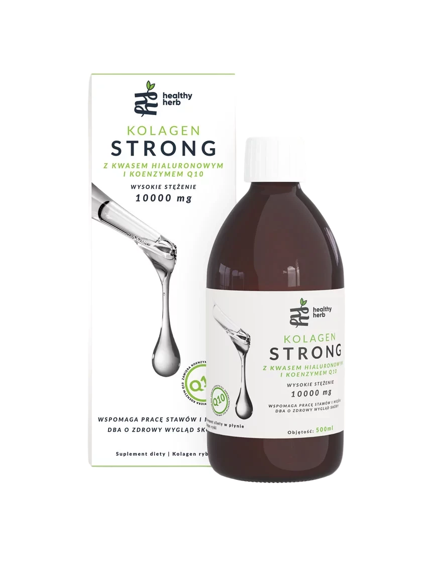 - Healthy Herb Kolagen STRONG 10000 mg to zaawansowany suplement diety w płynnej formie, stworzony z myślą o osobach dbających o kondycję stawów, skóry, włosów, paznokci oraz ogólną witalność.