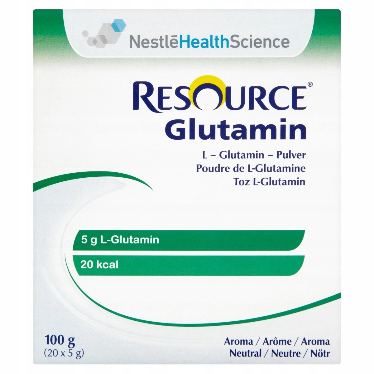 Dietetyczny środek spożywczy specjalnego przeznaczenia medycznego. Resource Glutamin to niekompletny pod względem odżywczym preparat aminokwasowy w proszku, zawierający L-glutaminę, przeznaczony do żywienia doustnego i/lub przez zgłębnik. Produkt jest przeznaczony do postępowania dietetycznego u pacjentów ze zwiększonym zapotrzebowaniem na glutaminę, np. w stresie metabolicznym, po urazach lub przy ciężkich oparzeniach.