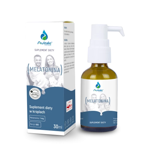 - Avitale Melatonina 1 mg to suplement diety w wygodnej płynnej formie, umożliwiającej precyzyjne dawkowanie i szybkie wchłanianie substancji aktywnej.