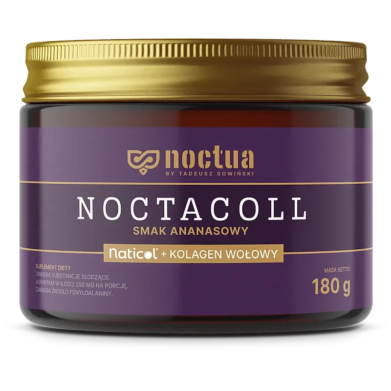 - Noctua Noctacoll to zaawansowany suplement diety łączący dwa rodzaje peptydów kolagenowych: Naticol® – kolagen rybi (morski) oraz Colpropur D® – kolagen wołowy.