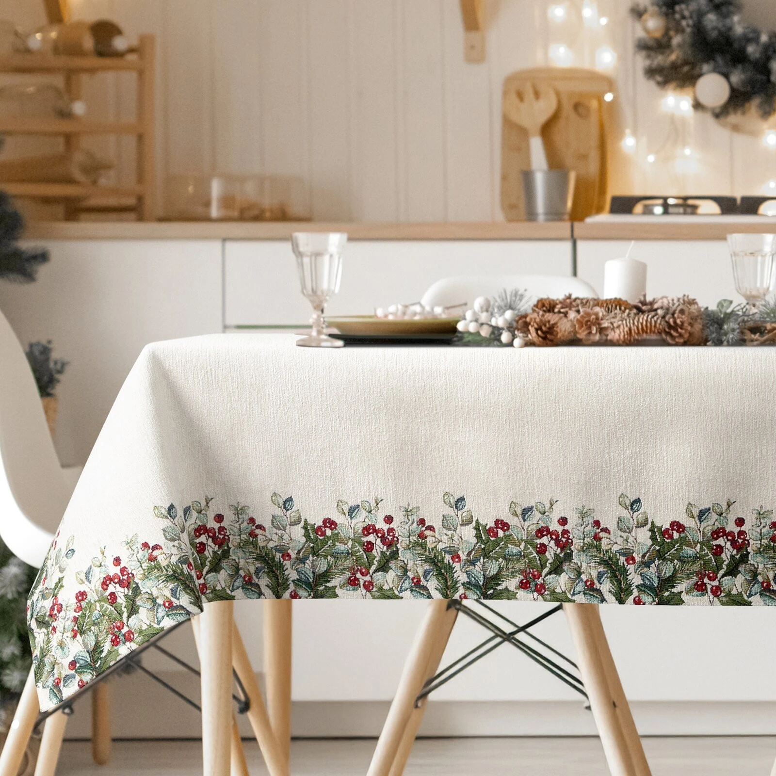 Gobelinowy obrus dekoracyjny szerokość: 140 cm, długość: 180 cm, kolor: naturalny, Gramatura: 450 GSM, Skład: 85% poliester, 15% bawełna