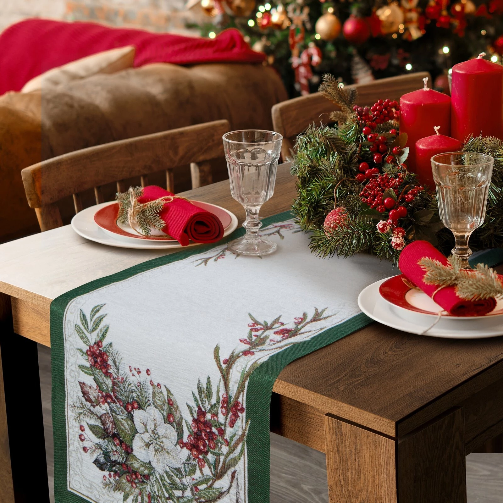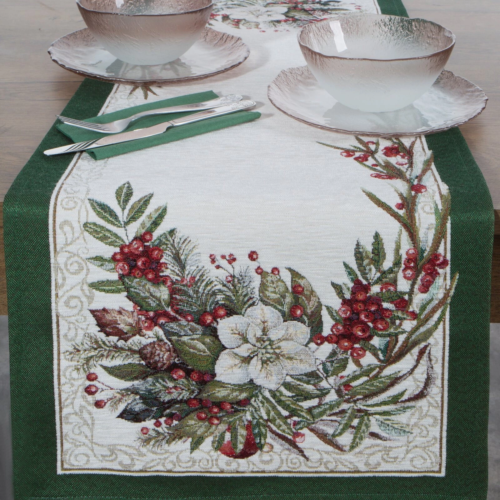 Gobelinowy bieżnik dekoracyjny szerokość: 45 cm, długość: 140 cm, kolor: zielony, Gramatura: 450 GSM, Skład: 85% poliester, 15% bawełna