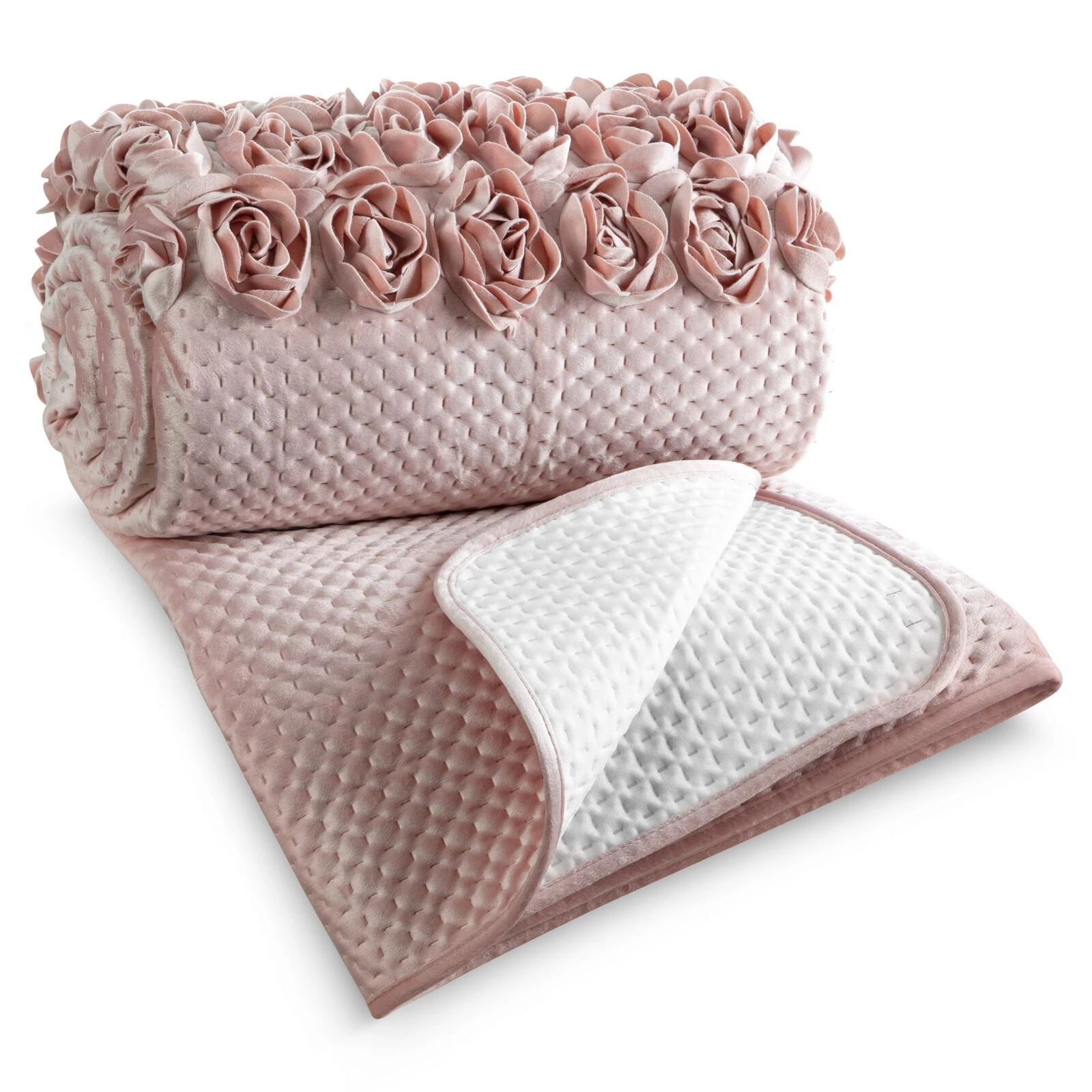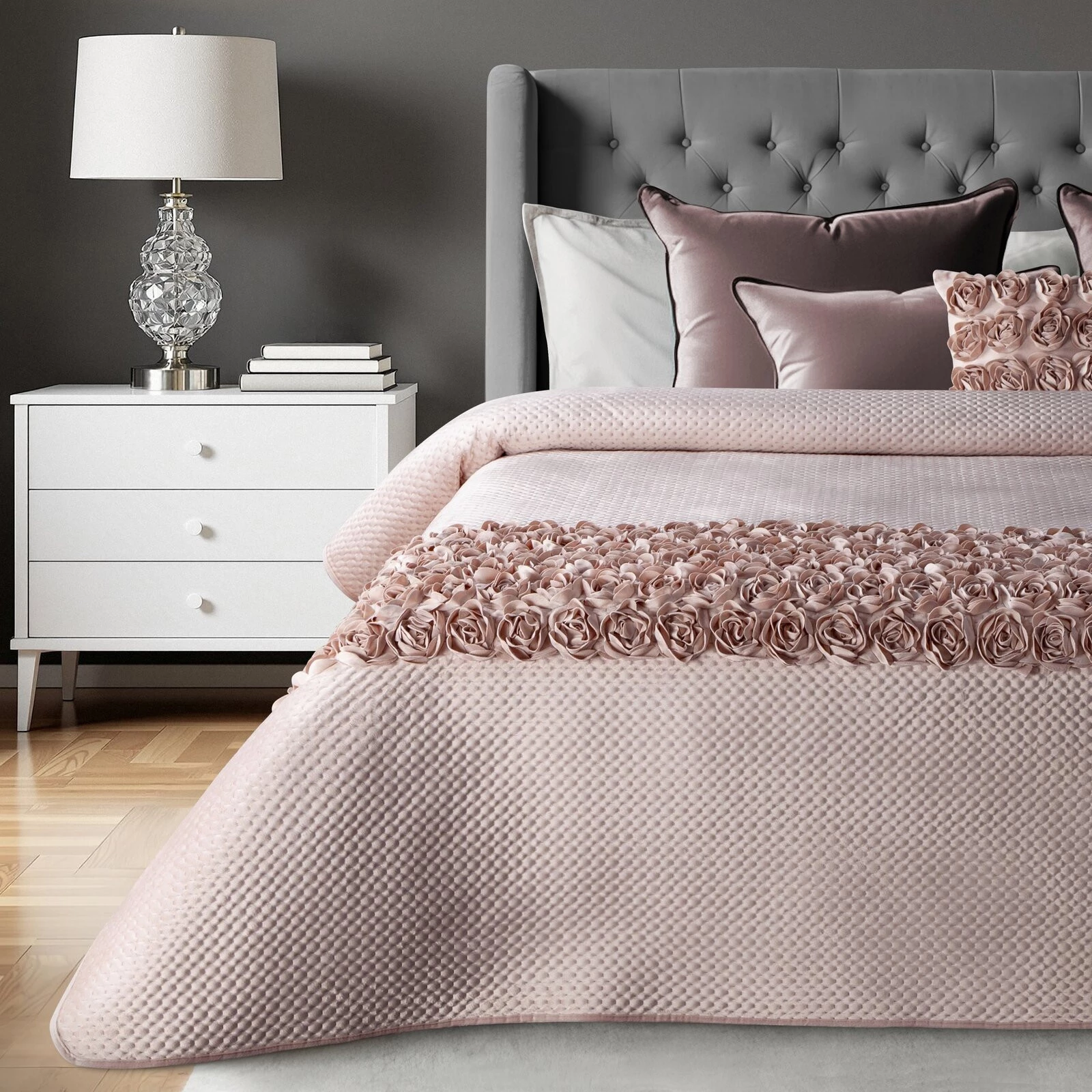 Narzuta welwetowa z aplikacją w kształcie róż szerokość: 220 cm, długość: 240 cm, kolor: pudrowy, Gramatura: 390 GSM, Skład: 100% poliester