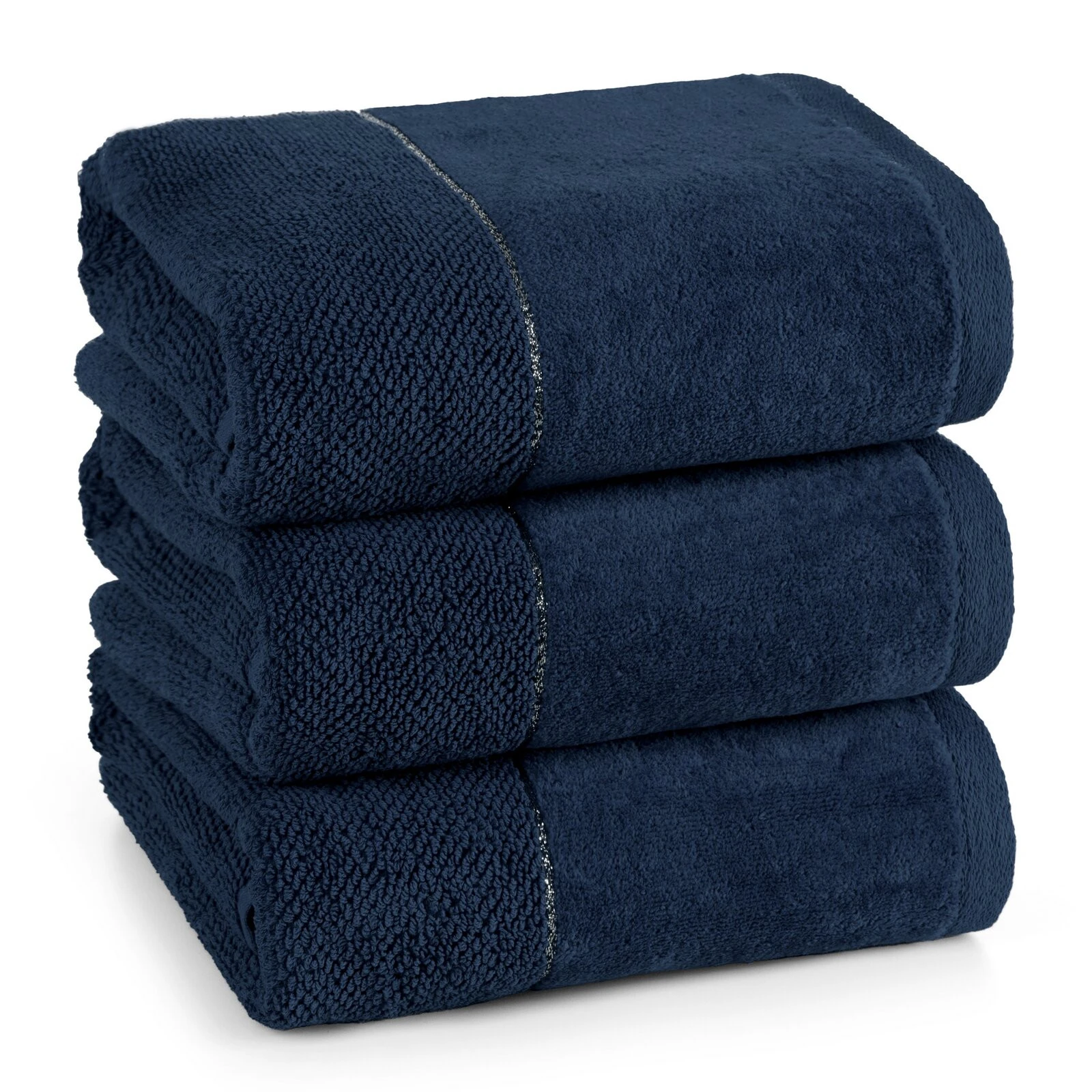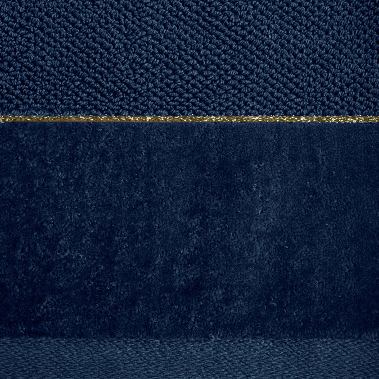 Ręcznik bawełniany z welurową bordiurą i błyszczącą nicią szerokość: 50 cm, długość: 90 cm, kolor: granatowy, Gramatura: 550 GSM, Skład: 100% bawełna; część ozdobna: 97% bawełna, 3% poliester