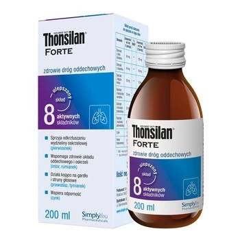 Simply You Thonsilan Forte syrop 120 ml to suplement diety w formie syropu zawierający zaawansowaną kompozycję składników w wzmocnionej formule Forte, charakteryzujący się przyjemną konsystencją i starannie opracowaną recepturą. Produkt wyróżnia się wygodną płynną formą syropu i wykorzystaniem wzmocnionej formuły Forte, która może zawierać podwyższone stężenie składników aktywnych w porównaniu do standardowych preparatów. Syrop zawiera cynk, który przyczynia się do prawidłowego funkcjonowania układu odpornościowego.