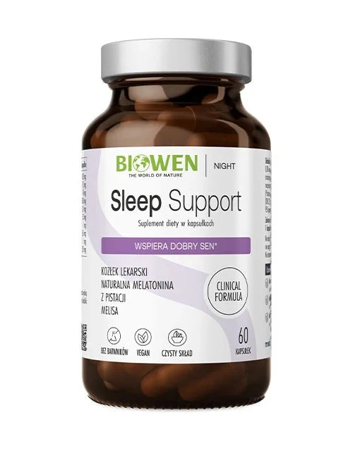 - Biowen Sleep Support to suplement diety w kapsułkach, zawierający kompozycję naturalnych ekstraktów roślinnych: melisy, kozłka lekarskiego, męczennicy oraz standaryzowanego ekstraktu z pistacji Melostacio-GOLD®, będącego źródłem melatoniny i tanin.