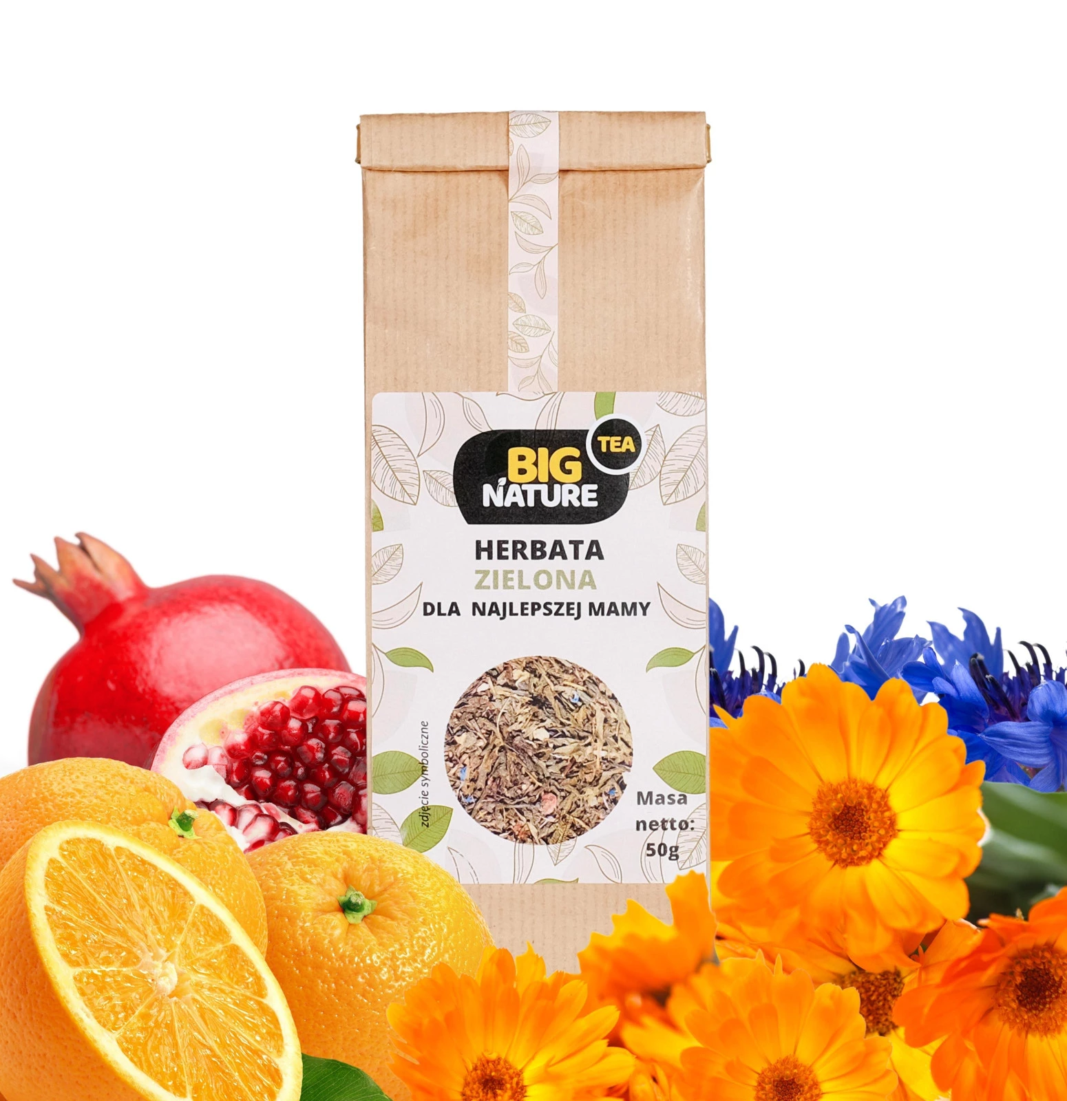 Składniki: herbata zielona, aromat, skórka pomarańczy, skórka granat, nagietek, bławatek.