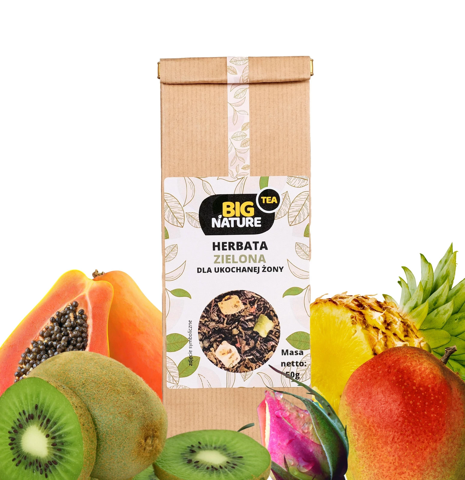 Składniki: herbata zielona, aromat, papaja, ananas, mango, kiwi, róża pąk.