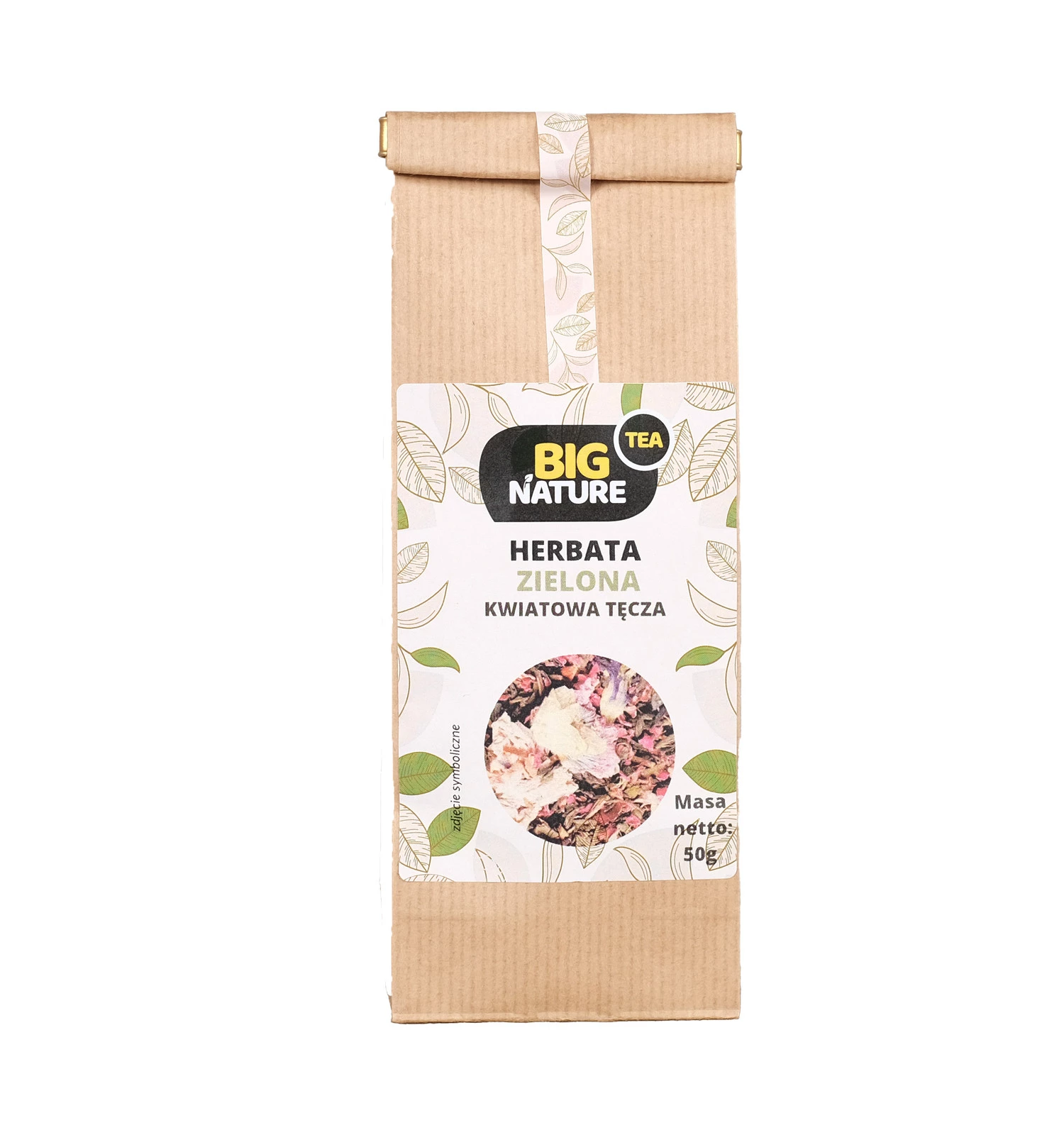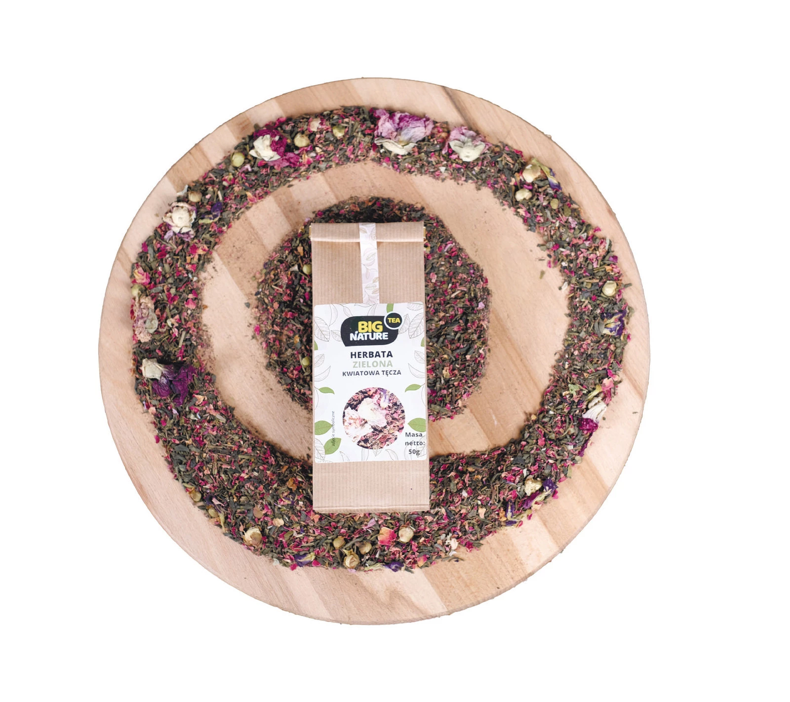 Opis: Opakowanie zawiera 50g zielonej herbaty "Kwiatowa Tęcza".