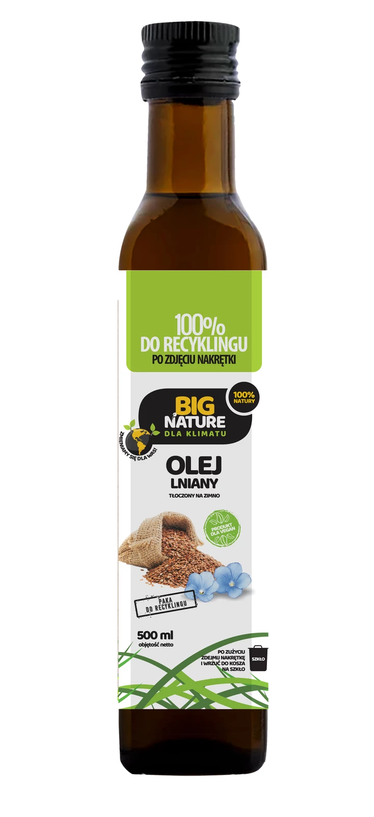 Opakowanie zawiera 500ml oleju lnianego tłoczonego na zimno.