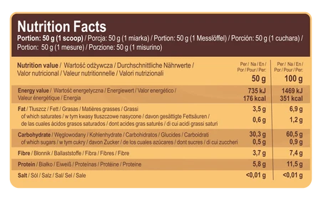 7Nutrition Instant Oats to drobno zmielona mąka owsiana, która po zalaniu wodą lub mlekiem tworzy lekką, gładką i sycącą owsiankę. Produkt jest naturalnym źródłem węglowodanów złożonych, błonnika pokarmowego oraz białka roślinnego, dzięki czemu sprawdza się jako szybki, wartościowy posiłek w ciągu dnia.
