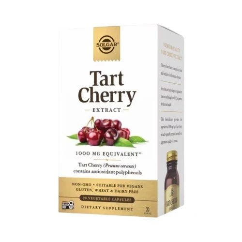 SOLGAR Tart Cherry to suplement diety zawierający ekstrakt z owoców wiśni (Prunus cerasus) w wygodnej formie kapsułek. Jedna porcja dzienna dostarcza skoncentrowaną ilość surowca roślinnego – odpowiadającą 1000 mg owocu (z 250 mg ekstraktu 4:1).